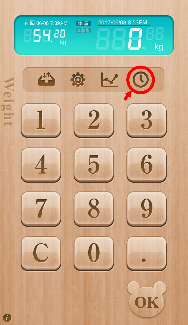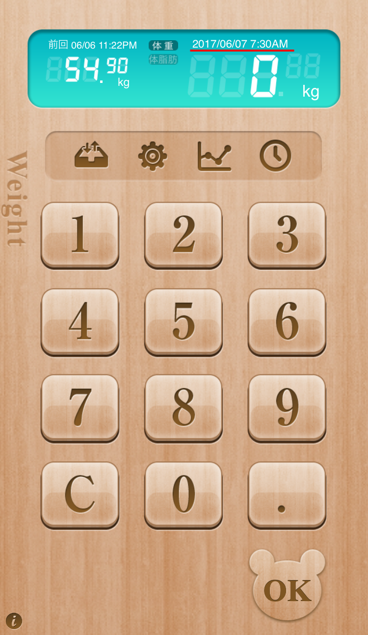 数字ボタンから、体重の数値を入力して、OKボタンを押してください。