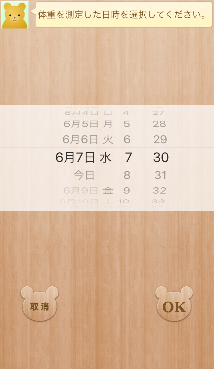 このような日時選択画面が開きますので、体重を計ったときの日時を選び、OKボタンを押してください。