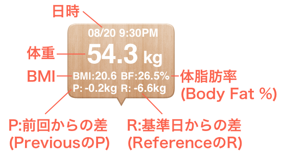 詳細表示では、そのデータの日時、体重、体脂肪率(BF)、BMI、前回からの差分(P:Previous)、基準日からの差分(R:Reference)が見られます。