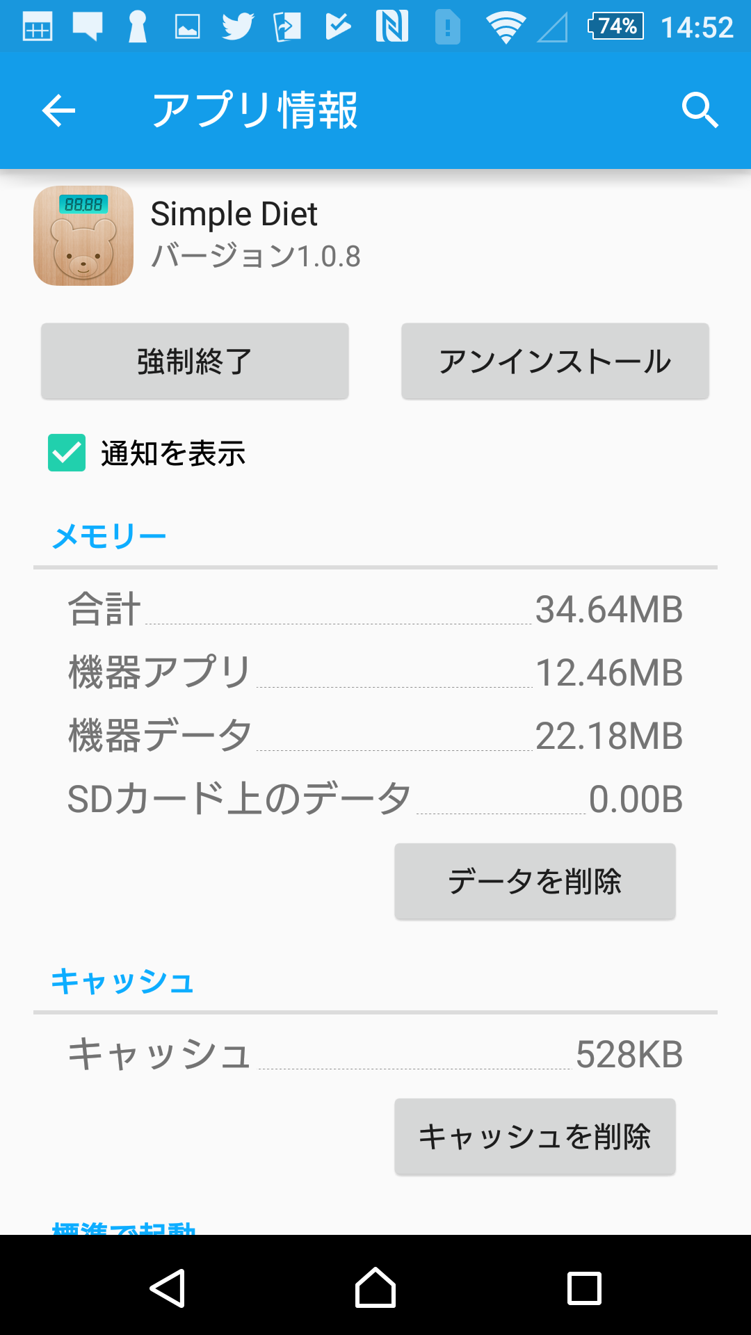 Androidのホーム画面から、「設定」→「アプリ」→「Simple Diet」(→「ストレージ」)※1を選択していただき、「アプリ情報」画面内にある「データを削除」ボタンを押していただくと、アプリのデータを削除してもよいかを確認するメッセージが表示されます。