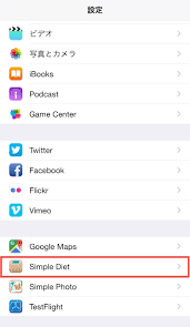 iOSのホーム画面から「設定」アプリを開き、下の方にスクロールして「Simple Diet」という項目を探してください。