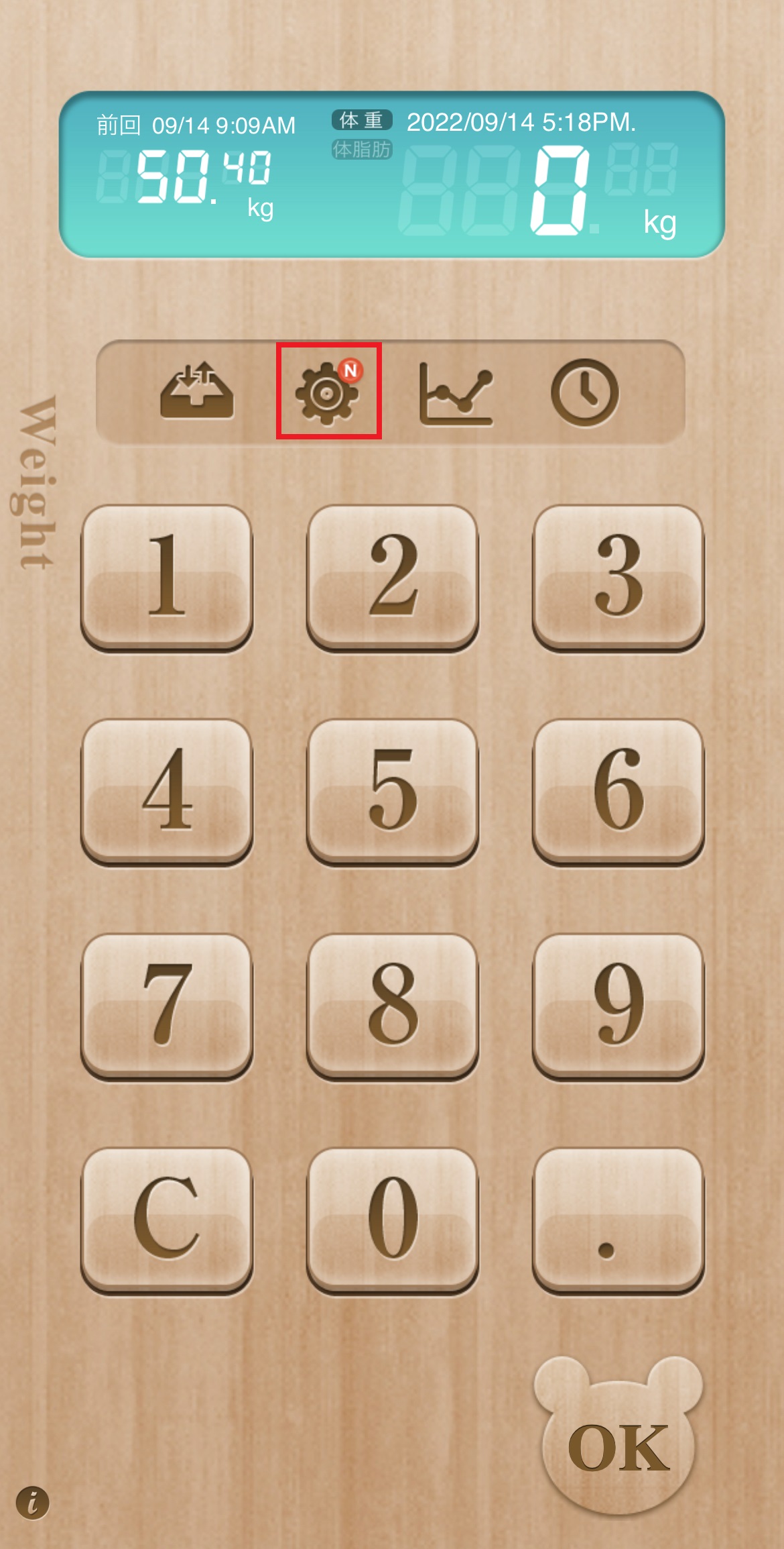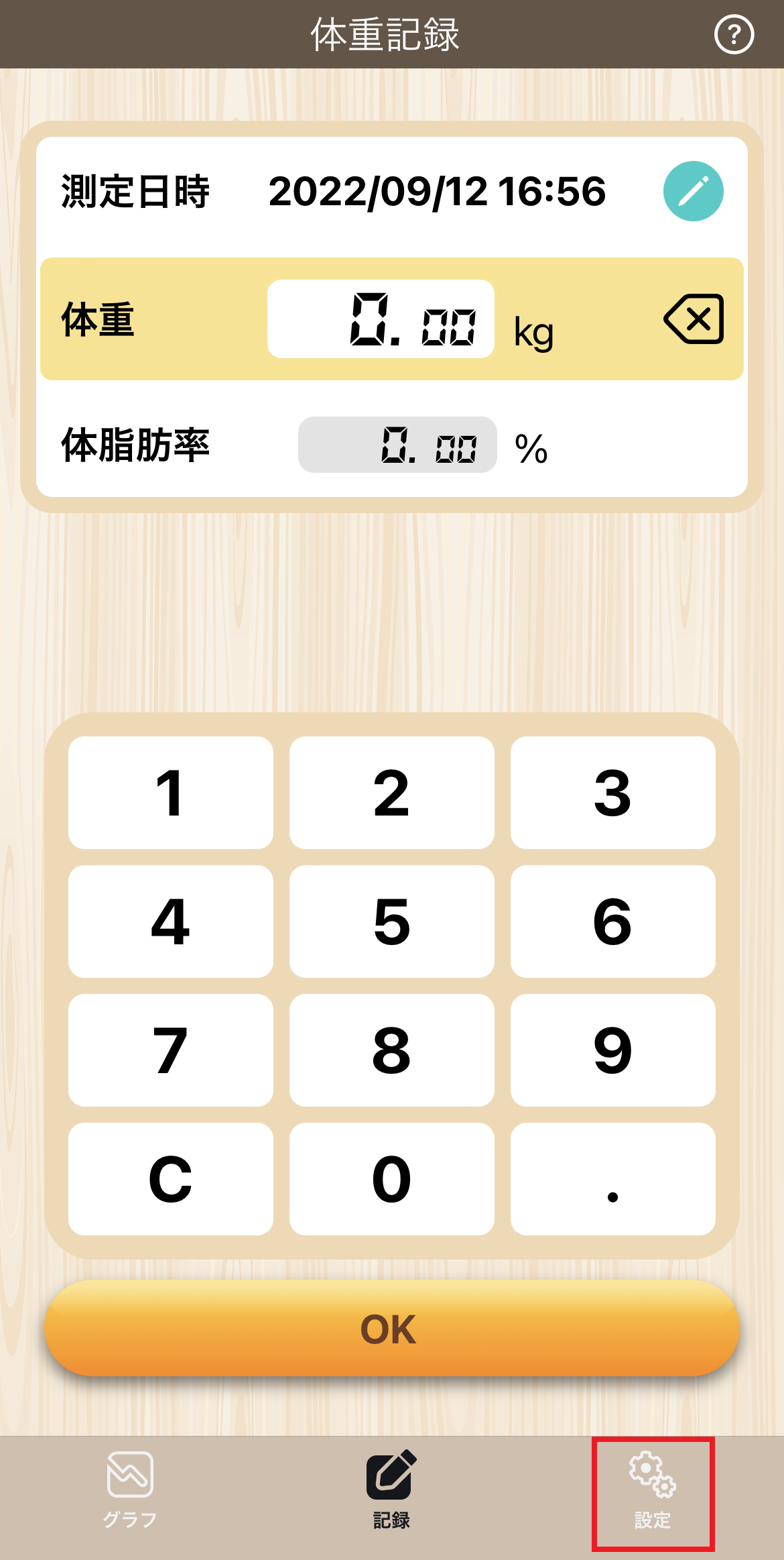 身長や目標体重などの設定を変更するには、タブバーの「設定」ボタンを押してください。
