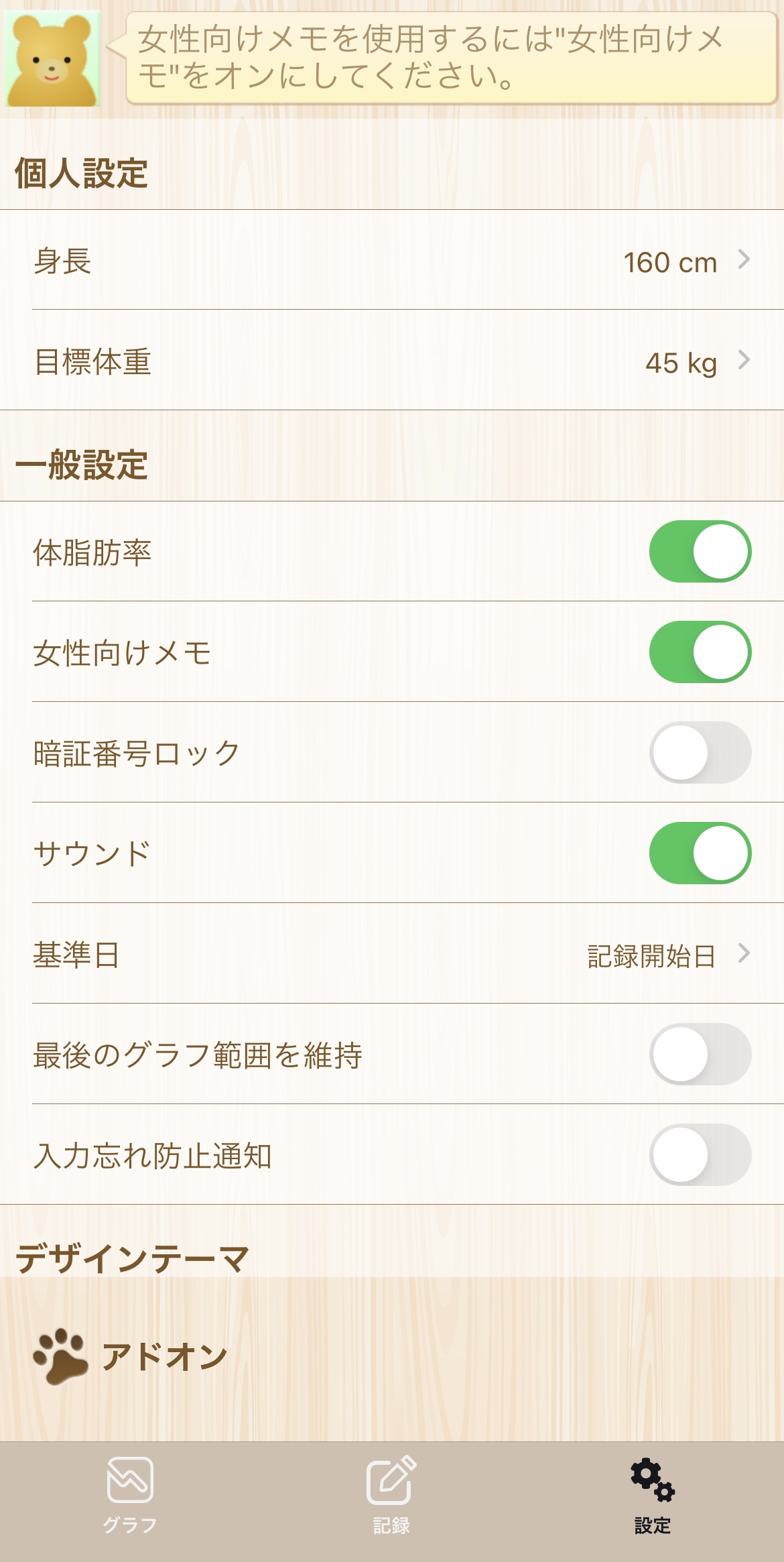 - 女性向けメモを使用するかどうかを切り替えられます。