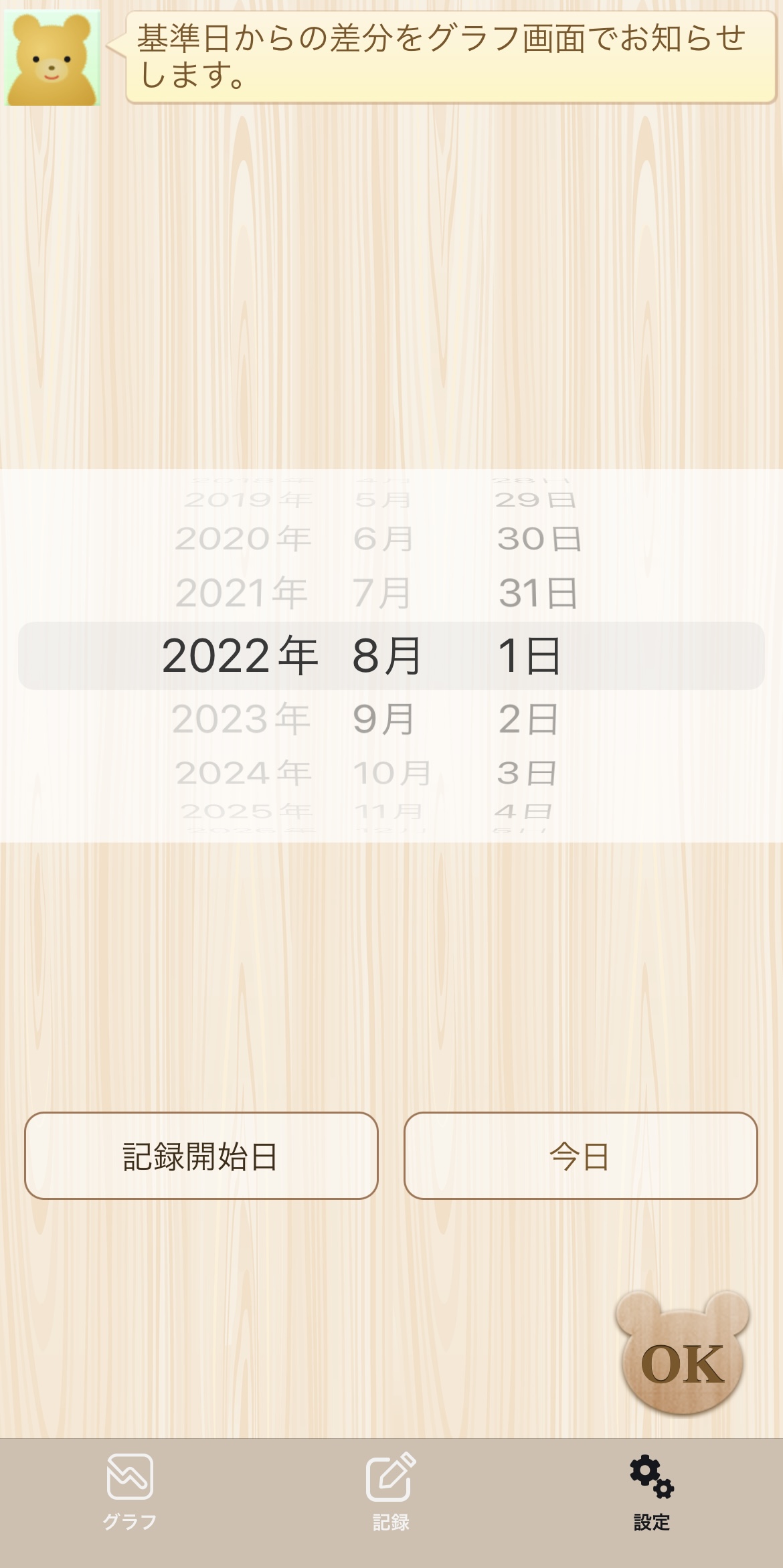 デフォルトでは記録を開始した日に設定されていますが、基準日の設定画面で最初の記録から現在までの任意の日付を設定できます。