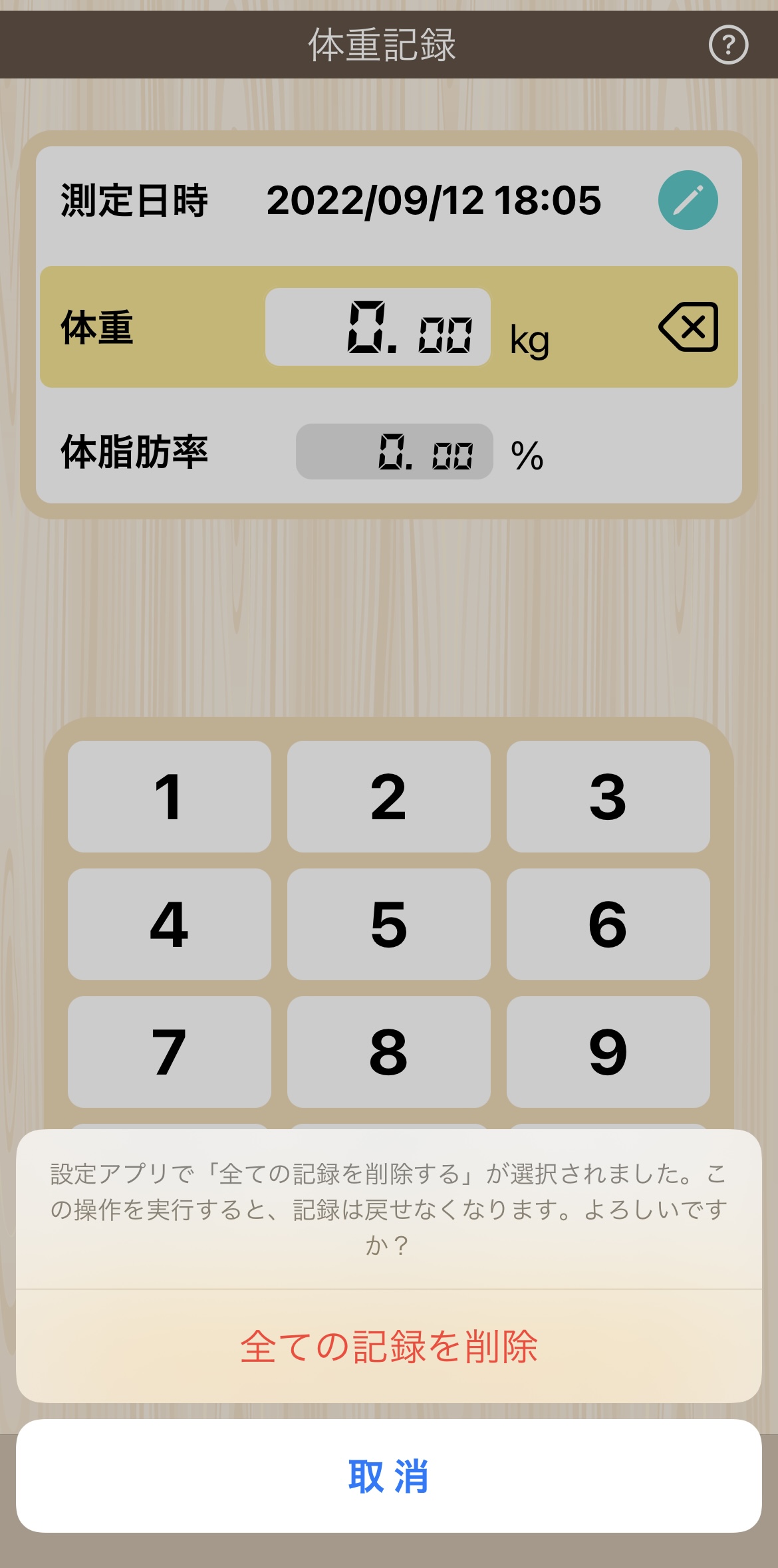 全ての記録を削除するには、「全ての記録を削除」を選択して、一度設定アプリを終了します。次にシンプル・ダイエットを起動したときに、本当に削除しても良いか、確認が表示されます。