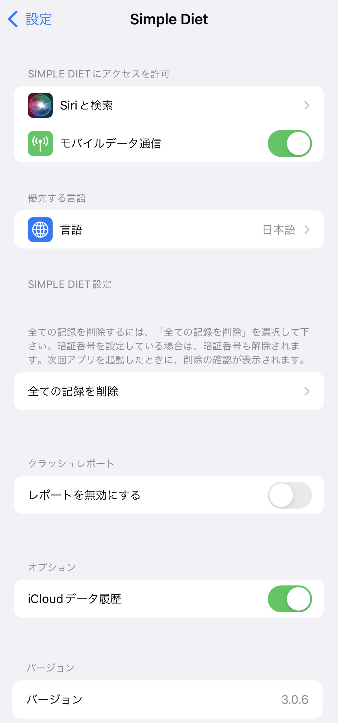 「Simple Diet」を選択すると、「全ての記録を削除」、「iCloudデータ履歴」、「クラッシュレポートを無効にする」、「バージョン」という項目があります。