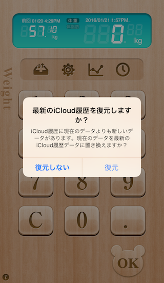 ひとつのiOSデバイスでアプリを起動した際、iCloud上に他のデバイスで作成された新しい履歴が存在する場合は、その旨のメッセージが表示されます。(データが全く存在しない場合は確認メッセージは表示されず、自動的に最新のデータが復元されます。)