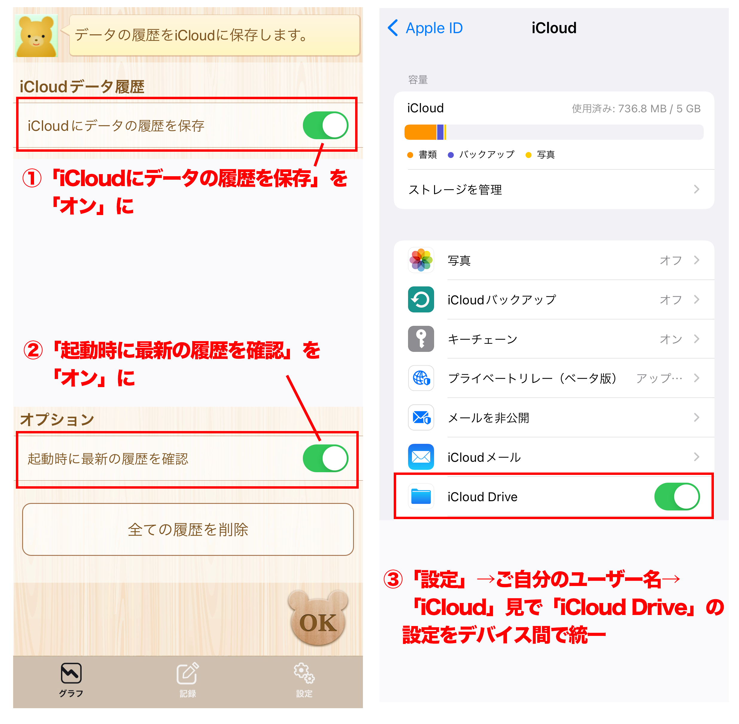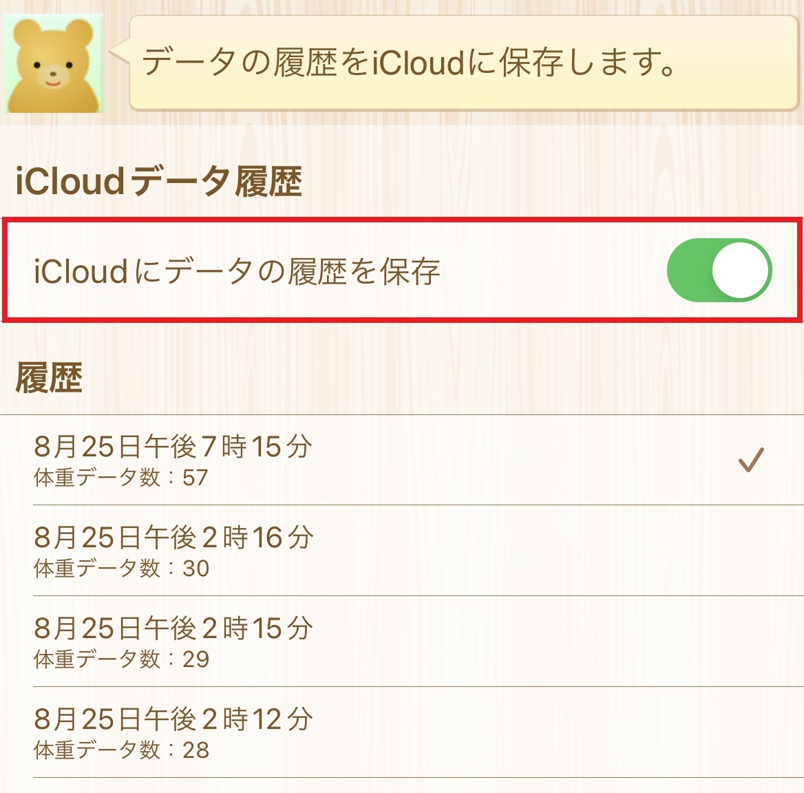 iCloudデータ履歴機能を有効にするには、アプリ内の設定で、「iCloudデータ履歴」のスイッチをオンにしてください。