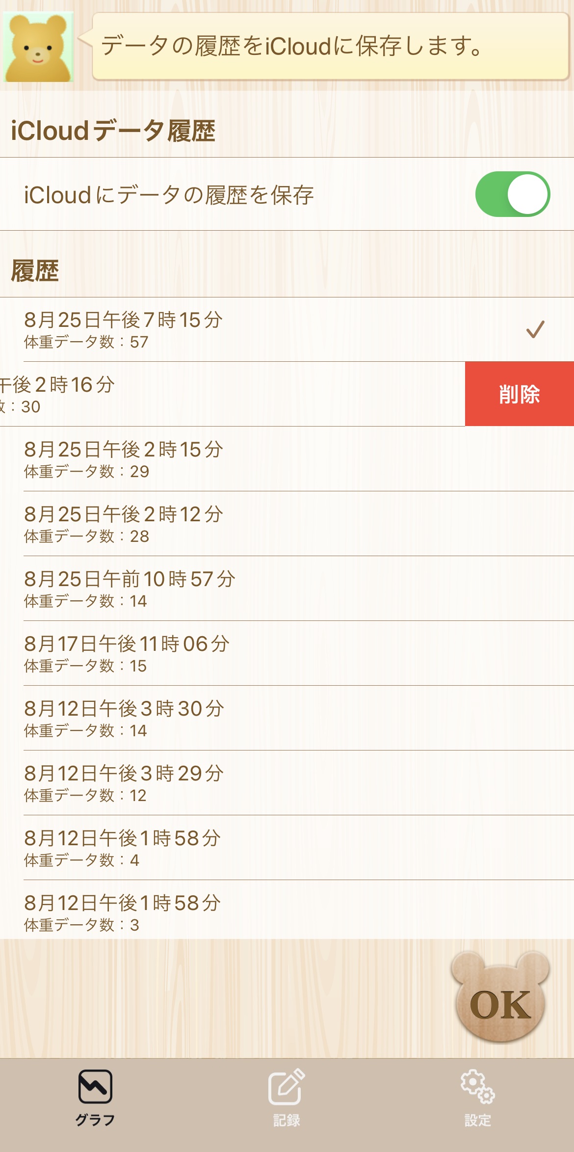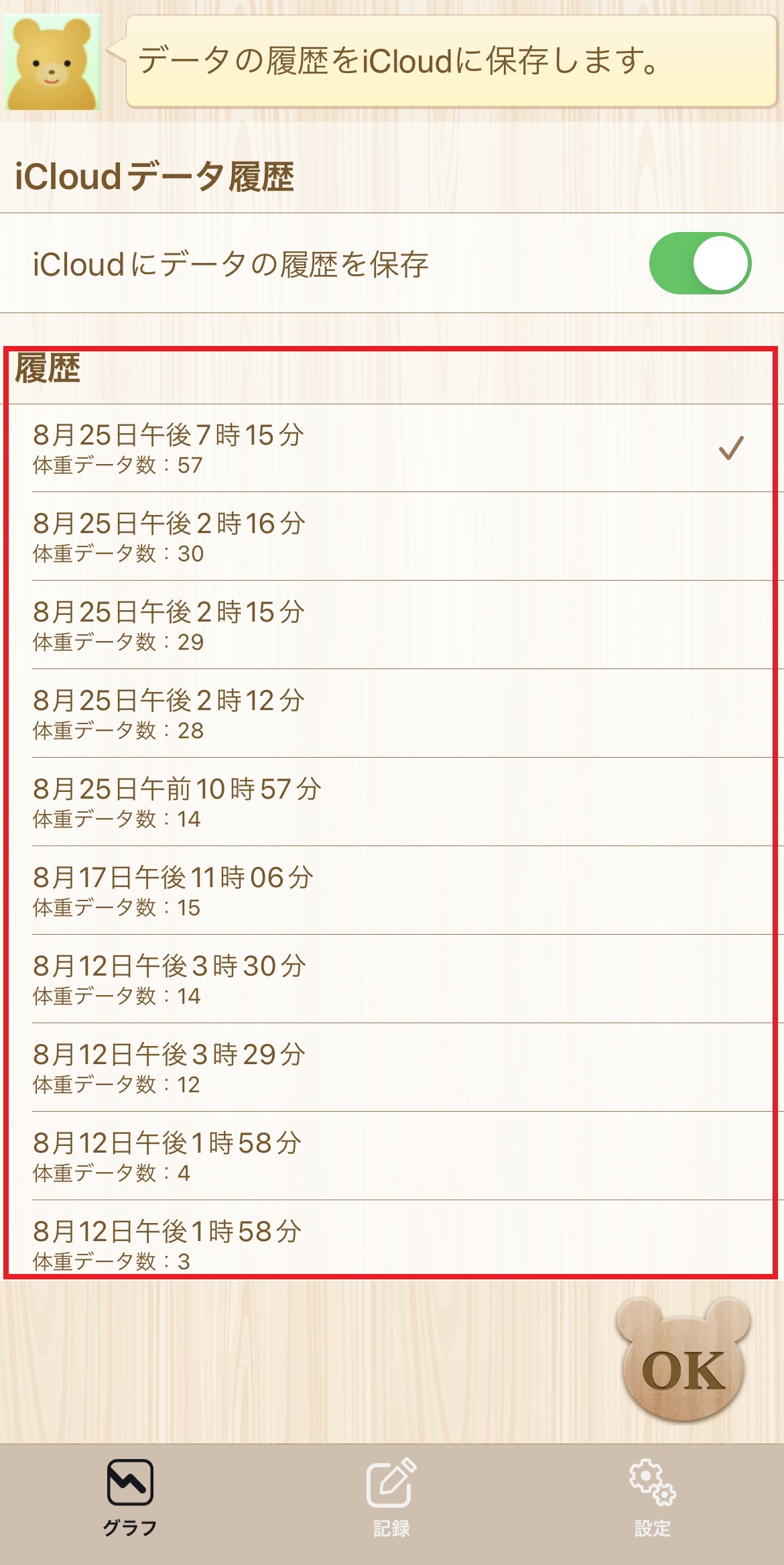 iCloudのデータ履歴は、アプリ内の設定画面から、「iCloudデータ履歴」を選び、「履歴」欄に表示されるリストでご確認いただけます。それぞれの履歴は最後のデータを保存した日時と体重データの数で表示されています。右側に✓マークがついているのは現在のデータです。