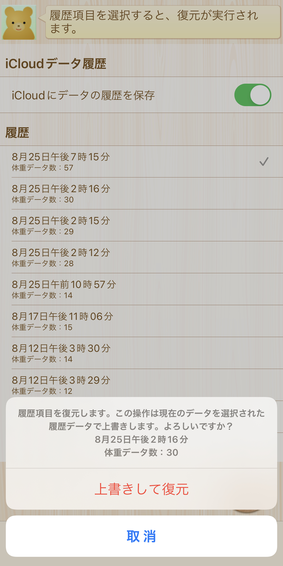 アプリ内に既にデータが存在する場合は、履歴から上書きしてもよいかを尋ねるアクションシートが表示されますので、メッセージの内容を確認して、「上書きして復元」ボタンをタップして下さい。