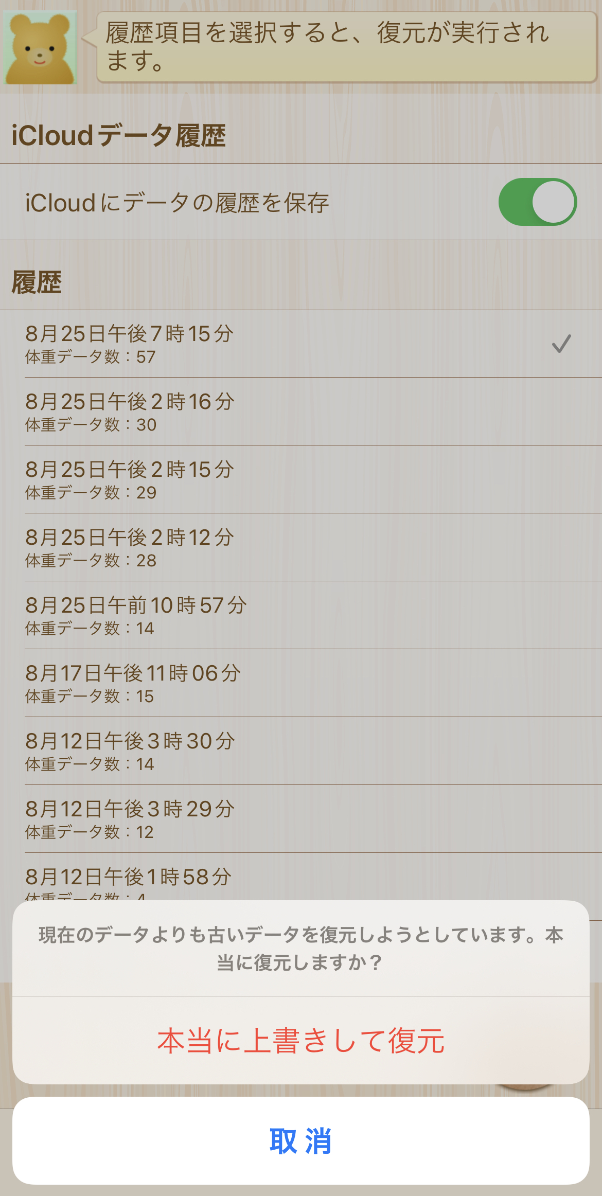 また、復元しようとしているデータが現在のデータよりも古い場合には、古いデータで置き換えてもよいかをもう一度確認するアクションシートが表示されますので、確認して、「本当に上書きして復元」ボタンをタップして下さい。