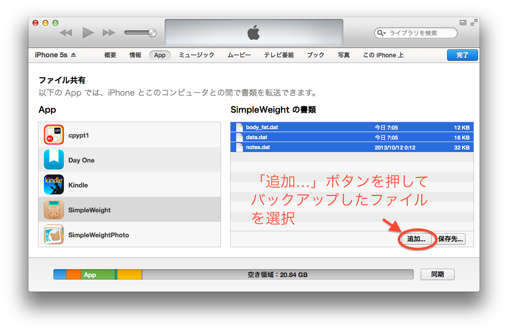 また、手順1で逆に「追加…」ボタンを押してPCに保存したファイルを選択するか、またはファイルをiTunesの「SimpleWeightの書類」欄にドラッグ&ドロップすることで、バックアップしたデータを復元できます。